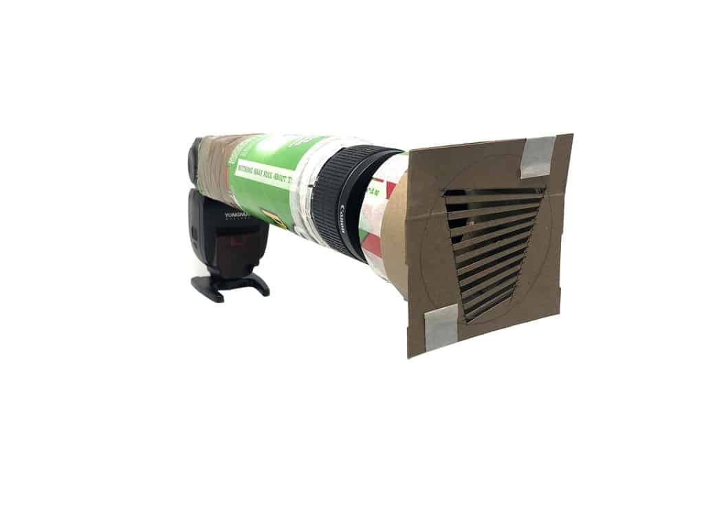 - Wrap cardboard and tape around the lens body to make a snug fit in the cardboard tube.